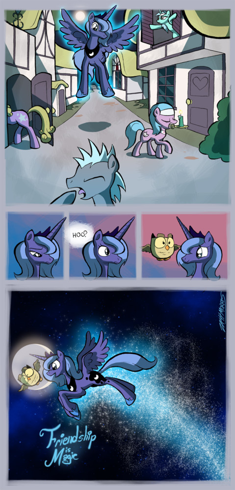 Description: Princess Luna is fed up with not having any friends. So one day, she uses her magical pony powers to travel across the pony multiverse. Surely one there is some pony who will be her friend? What could possibly go wrong?
